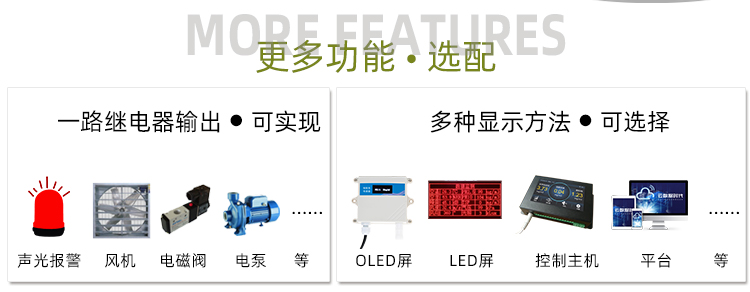 報警(控制)輸出(選配):1路繼電器,觸點容量(阻性):3A/AC220V、DC24V