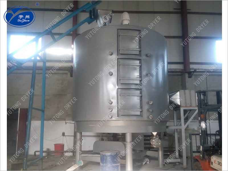 Closed disc continuous dryer is in the atmospheric pressure disc continuous dryer on the basis of closed treatment, so more suitable for the need to recover solvents, materials easy oxidation, material odor is heavy occasions, it has: continuous operation, closed operation, evaporation strength, humidity gradient distribution reasonable, low power consumption, small footprint, environmental protection and other advantages. At the same time, its configuration is simple, does not use hot air as the heating medium, so there will be no product loss caused by bad separation of hot air and dust with tail gas entrainment. The disc continuous dryer is composed of a drying disc, a rake arm, a number of rake blades installed on the rake arm, roller, a spindle, a transmission device, a shell, etc., and a heating medium is passed into the hollow drying disc. The material is transported by the rake leaf on the surface of the drying disc, turned, and moved in the Archimedes spiral track. During the movement, the drying disc is heated, heat and mass transfer is carried out to complete the drying operation. According to the yield, nature, initial and final moisture content of the drying disc, the number of drying disc layers (drying area) is determined. The disc continuous dryer works vertically. The wet material is added by the feeding port at the top and discharged from the bottom of the dryer after passing through the drying pan of each layer. The moisture released from the material is discharged into the atmosphere by the induced draft fan after dust removal.