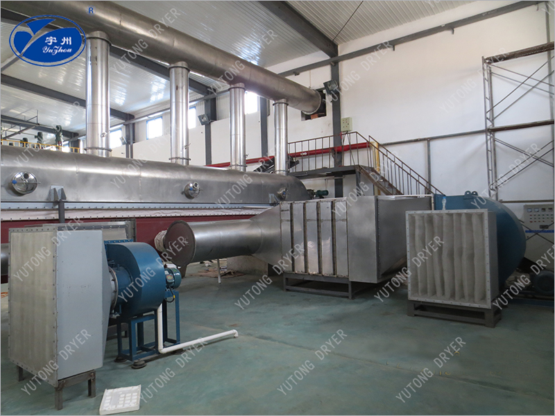 The material enters the machine from the feed port and jumps forward on the air distribution plate under the action of the vibration force provided by the vibration motor or other means. At the same time, the air is heated to a certain temperature after being filtered and enters the downwind chamber of the dryer through the tuyere. Under the dual action of the vibration force and the hot air flowing through the air distribution plate, the material is in a suspended state and contacts with the hot air flow. The intense turbulence between the material particles and the hot medium strengthens the heat and mass transfer process. The dried product is discharged from the discharge port, and the evaporated water and waste gas are recovered by the cyclone separator and discharged into the atmosphere. The lower bed body provides a stable air chamber with a certain pressure for the bed. Adjust the induced draft fan, so that the upper part of the bed material in the upper box to maintain a small negative pressure, maintain a good dry environment and prevent dust leakage.