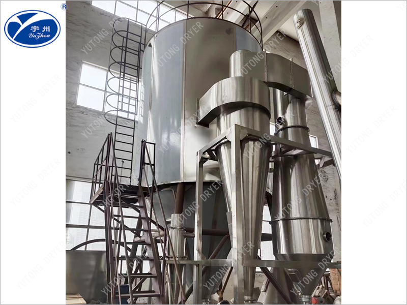 Spray dryer for open circulation, and flow, centrifugal atomization. The drying medium air is filtered by the primary and medium efficiency air filter according to the operation instructions, absorbed by the blower and then heated by the heater through the hot air distributor of the high efficiency filter into the spray drying main tower. The liquid material passes through the peristaltic pump according to the operation instructions, enters the high-speed rotating centrifugal nozzle, and is dispersed into small droplets under the action of centrifugal force. In the main spray drying tower, the small droplets are in full contact with the hot air, and are dried into products after heat exchange along its specific path, and then separated by a cyclone separator, the solid material is collected, and the gas medium is filtered and discharged. The whole spray system is easy to clean, no dead corners, in accordance with GMP requirements.