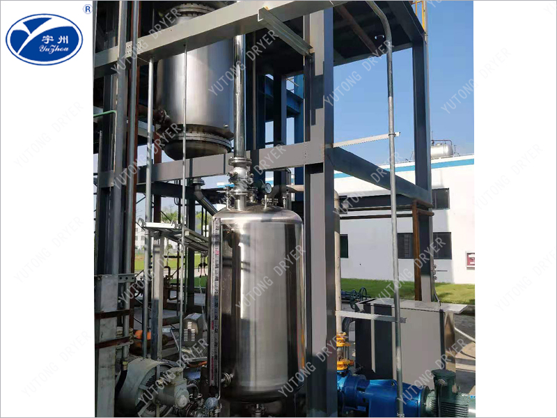 The overcurrent time of the material in the evaporator is very short, about 10 seconds; For commonly used activity scrapers, there are guiding grooves on the end face of the material being scraped, and the angle of inclination is usually 45 ℃. Changing the angle of inclination can change the flow time of the material. Under the scraping of the scraper, the material spirals down and leaves the evaporation section. Shorten the overcurrent time and effectively prevent the decomposition, polymerization, or deterioration of the product during the evaporation process.