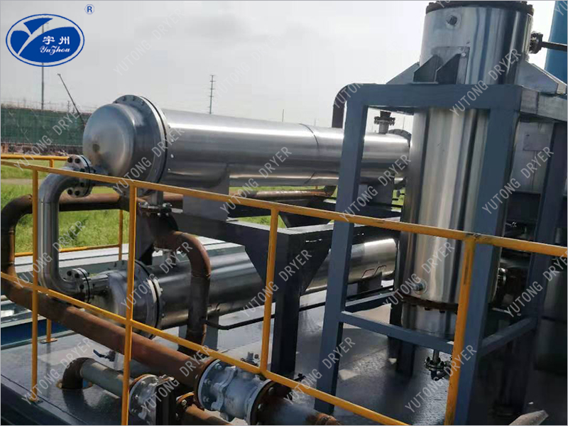 The material enters the evaporator radially from above the heating zone, and is distributed to the heating wall of the evaporator through the distributor. Then, the rotating scraper continuously and uniformly scrapes the material into a thin and uniform liquid film on the heating surface, and pushes it downwards in a spiral shape. During this process, the rotating scraper ensures continuous and uniform liquid film to generate high-speed turbulence, and prevents the liquid film from coking and scaling on the heating surface, thereby improving the total transfer coefficient. Light components are evaporated to form a steam stream that rises and passes through a vapor-liquid separator to reach an external condenser directly connected to the evaporator. Heavy components are discharged from the cone at the bottom of the evaporator.