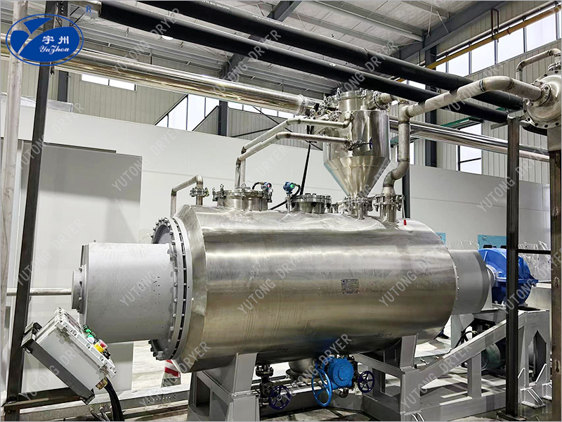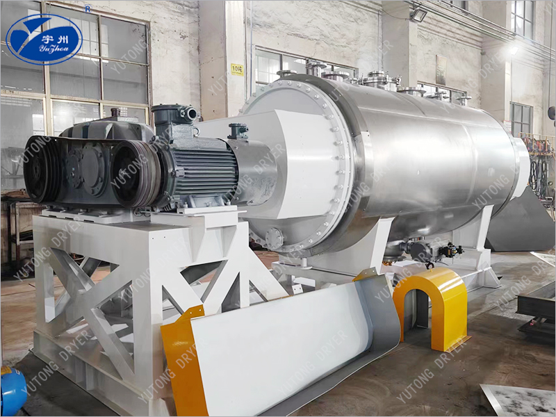 This machine is a novel horizontal intermittent vacuum drying equipment. Wet materials are evaporated through conduction, and a scraper stirrer is equipped to continuously remove the materials on the hot surface and move them inside the container to form a circulating flow. After the water evaporates, it is pumped out by a vacuum pump.