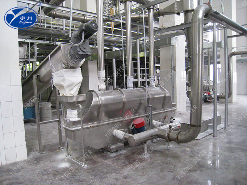 物料自進(jìn)料口進(jìn)入機(jī)內(nèi),在振動(dòng)力作用下,物料沿水平面流化床拋擲,向前連續(xù)運(yùn)動(dòng),熱風(fēng)向上穿過(guò)流化床同濕物料換熱后,濕空氣經(jīng)旋風(fēng)分離器除塵后由排風(fēng)口排出.干燥物料由排料口排出。