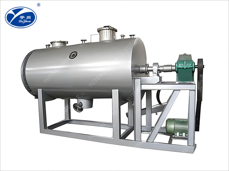 本機是一種新型臥式間歇式真空干燥設備,濕物料經傳導蒸發,帶有刮板攪拌器不斷清除內壁上的物料,并在容器內推移形成循環流,水份蒸發后由真空泵抽出。