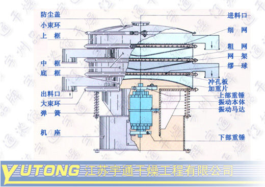 本機由料斗、振蕩室、聯軸器、電機組成。振蕩室內有偏心輪、橡膠軟墊、主軸、軸承等組成,可調節的偏心重錘經馬達驅動傳達到主軸中心線,在不平衡狀態下產生離心力,使物料強度改變在篩內形成軌道旋渦。重錘調節器的振幅大小可根據不同物料和篩網進行調整。