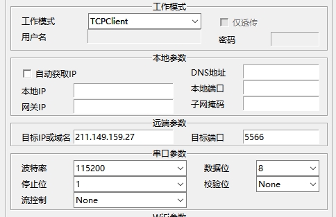 5. 做客戶端。波特率為115200 校驗數據停止為 0 8 1。串口流控制為None。工作方式為TCP Client。目標ip:自己服務器的ip,端口自己服務器開發端口,其他不用變。點擊端口2設置。