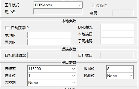 4. 看一下自己的網關做服務端開發服務器網絡端口,且不被防火墻阻攔端口,波特率為115200 校驗數據停止為 0 8 1。串口流控制為None。工作方式為TCP Server。本地端口自己設。