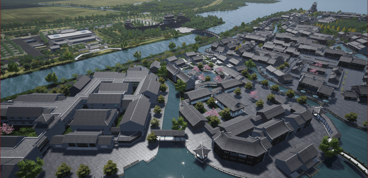 運(yùn)用目前技術(shù)領(lǐng)先的3D建模技術(shù),創(chuàng)造出融合景區(qū)文化、風(fēng)格理念的立體場(chǎng)景,將景區(qū)內(nèi)大大小小建筑設(shè)施、小品、山川湖泊、邊緣地界等進(jìn)行數(shù)字化還原,包含區(qū)域內(nèi)的古鎮(zhèn)建筑、游客集散中心以及湖面需要還原的水質(zhì),空地部分做虛化處理。